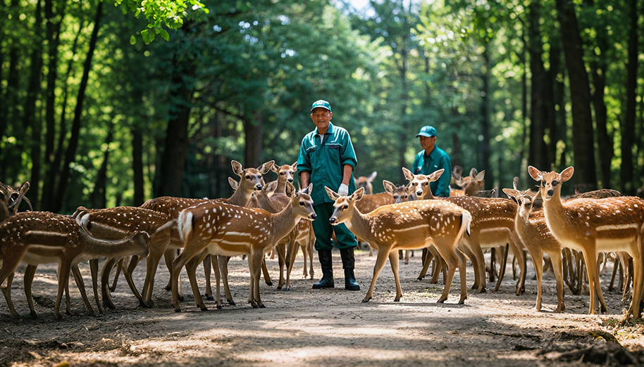 其中“京西鹿谷梅花鹿生態養殖繁育基地”,群山環繞、空氣清新、水源優質且充足,為梅花鹿的生長營造了良好的自然條件?;貎戎脖回S富,有大量梅花鹿喜愛的嫩草和樹葉,充足的食物資源保障了梅花鹿飲食的多樣性。同時開闊的空間和適宜的氣候條件,為梅花鹿的生存提供的得天獨厚的優勢,使其能夠自由地繁衍生息。
